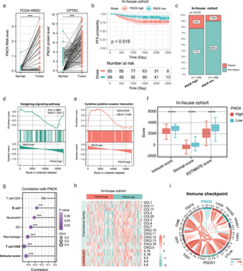 An initial exploration into the predictive significance of PNCK for prognosis and immune-inflammatory response. (a) Differential expression of PNCK in TCGA-HNSC cancer tissues and normal tissues. Two-tailed paired Student’s t-test. (b) Kaplan-Meier progression-free survival (PFS) curve for 193 head and neck tumor patients with high or low PNCK expression in the cohort from Fujian Provincial Cancer Hospital. Two-sided log-rank test. (c) Recurrence rates in patients from Fujian Provincial Cancer Hospital with high versus low PNCK expression. The red bar represents relapse, and the blue bar indicates non-relapse. Two-tailed χ2 test. (d, e) GSEA revealing pro-carcinogenic-related and immune-related pathways correlated with PNCK expression in the in-house dataset (n=193 biologically independent samples). High expression of PNCK was enriched in the Hedgehog signaling pathway (d), whereas low expression was enriched in the cytokine-cytokine receptor pathway (e). (f) Significant differences in immune score, stromal score, and ESTIMATE score between PNCK high and low expression groups. The upper, middle and lower horizontal lines of the box represent the upper, median and lower quartile respectively. Two-tailed unpaired Student’s t-test. Data are presented as mean values±SD. (g) Association of PNCK expression with diverse immune cells and the immune score. Two-tailed Spearman correlation is reported. (h) The heatmap illustrates the differential cytokine expression profiles between high and low PNCK expression groups. (i) Association between PNCK expression and immune checkpoint marker expression. Two-tailed Spearman correlation is reported. HNSC, head and neck squamous cell. *** indicates p < 0.001, and **** indicates p < 0.0001. |