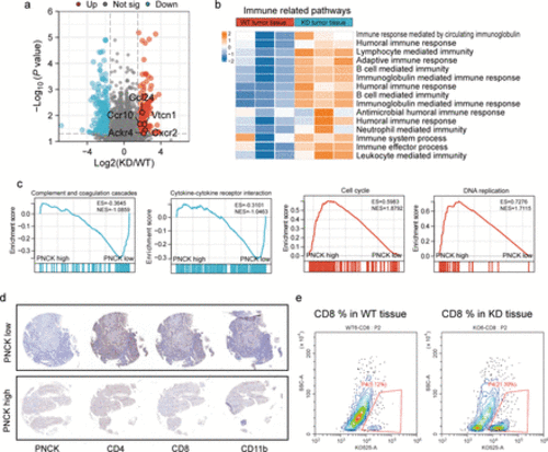 Knockdown of the Pnck gene induces antitumor immune response. (a) Volcano plot showing DEGs in the sequencing results, including upregulation of genes encoding immune cell chemotactic factors, like Ccl24, Ccr10, Vtcn1, Ackr4 and Cxcr2. Differentially expressed genes were identified with the threshold of |log2(fold change)| >1 and false discovery rate (FDR)<0.05. (b) Heatmap showing the enrichment and upregulation of immune-related pathways in the Pnck-KD group. (c) GSEA enrichment analysis of complement and cytokine-related pathways in the PNCK low-expression group, and GSEA enrichment of cell cycle and DNA repair-related pathways in the high-expression group. (d) Immunohistochemistry demonstrated the expression levels of CD4, CD8, and CD163 in PNCK high and low groups. (e) Infiltration abundance of CD8 T cells in mouse tumors in the WT and Pnck-KD group (n=3 biologically independent samples). |
