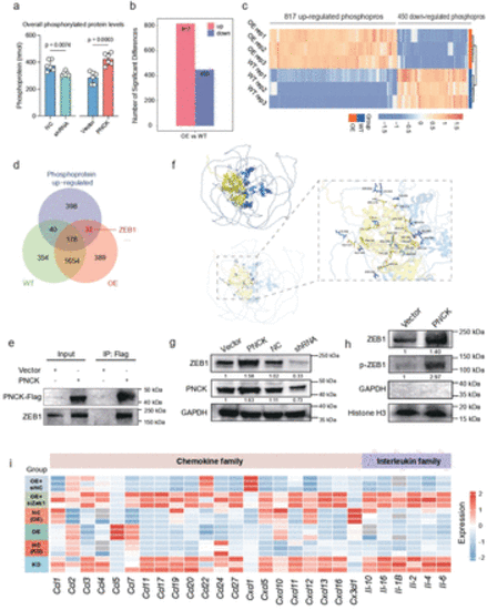PNCK regulates ZEB1 nuclear translocation and reshapes the tumor immune-suppressive microenvironment. (a) Quantification of overall phosphorylated protein levels in various cell samples to assess changes in the phosphorylation status. A two-tailed unpaired Student’s t-test was performed. Data are presented as mean values±SD. (b) Differential phosphorylated proteins between the PNCK overexpression group and the WT group. (c) Heatmap showing the expression pattern of differentially phosphorylated proteins in the PNCK OE and WT groups. (d) Venn diagram showing the intersection of upregulated phosphorylated proteins and proteins interacting with PNCK in WT and OE groups. (e) Co-immunoprecipitation (CO-IP) validation demonstrates the interaction between PNCK and ZEB1. (f) Surface diagram of the docking model and their interfacing residues between ZEB1 and PNCK protein (ZEB1, blue; PNCK, yellow; hydrogen bond interaction, dotted line). (g) Western blot analysis shows changes in ZEB1 expression levels in response to alterations in PNCK expression. (h) Western blot analysis shows the upregulation of ZEB1 and phosphorylated ZEB1 (p-ZEB1) in the nuclear protein fraction of the PNCK OE group. GAPDH was used as a cytoplasmic protein loading control, and Histone H3 was used as a nuclear protein loading control. (i) Cytokine array analysis of numerous immune-related cytokines across multiple experimental groups, including KD, NC(KD), OE, NC(OE), OE+siZEB1, and OE+siNC. |