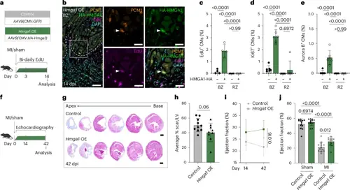 HMGA1 promotes CM proliferation and cardiac regeneration in injured adult mice. a, Schematic overview for experiments in b–e. b, Representative image of immunofluorescent staining against PCM-1, HA and EdU. Dashed line indicates the injury border. Arrowheads indicate HMGA1-HA+EdU+ CMs. Scale bars, 100 μm in overview and 20 μm in zoom-in. c–e, Quantification of EdU+ (c), Ki67+ (d) and Aurora B+ (e) CMs within the BZ and RZ of hearts transduced with HA-HMGA1. n = 4 hearts were analyzed for EdU and n = 6 for Ki67/Aurora B quantification. Datapoints represent individual hearts. Error bars indicate mean ± s.d. Statistics were performed using a one-way ANOVA followed by Tukey’s multiple comparisons test and show significant differences for % EdU+/Ki67+/AuroraB+ CMs in HMGA1-HA+ BZ CMs compared to HA− BZ CMs and RZ HA+/− CMs (P < 0.0001 for all). No significant difference was found between RZ HA− and HA+ cells for % EdU+ CMs (P > 0.99), % Ki67+ CMs (P = 0.6972) and % AuroraB+ CMs (P > 0.99). f, Workflow for mouse experiments in g–j. g, Representative images of control and Hmga1 OE hearts at 42 dpi stained with Masson’s trichrome. Distance between sections is 400 μm. Scale bars, 1 mm. h, Quantification of scar size in control (n = 10) and Hmga1 OE (n = 9) hearts at 42 dpi showing average % MI length/midline LV length. Error bars indicate mean ± s.d. Statistics were performed by two-tailed unpaired t-test and show no significant difference (P = 0.06). i, Quantification of EF at 14 dpi and 42 dpi of control (n = 13) and Hmga1 OE (n = 13) hearts. Error bars indicate mean ± s.d. Statistics were performed using a two-way ANOVA followed by Sidak’s multiple comparisons test and show a significant difference (P = 0.016). j, Quantification of EF at 42 dpi of sham (n = 13 control, n = 13 Hmga1 OE) and MI (n = 13 control, n = 12 Hmga1 OE) hearts. Datapoints represent individual hearts. Error bars indicate mean ± s.d. Statistics were performed using a one-way ANOVA followed by Tukey’s multiple comparisons test and show a significant difference between control sham/MI hearts (P < 0.0001), between Hmga1 OE sham/MI hearts (P < 0.0001) and between control and Hmga1 OE MI hearts (P = 0.01) but not between control and Hmga1 OE sham hearts (P = 0.6974). |