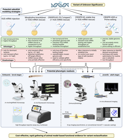 Overview of zebrafish strategies for the modeling of variants in genes associated with TAAD. Several different strategies are currently available for gene and variant testing in zebrafish. Each approach has specific advantages and disadvantages, rendering it more or less suitable for various purposes. Depending on the chosen strategy, phenotyping of the zebrafish can be performed in embryonic and larval stages, or also at later ages. Created in BioRender. Sips, P. (2025) |