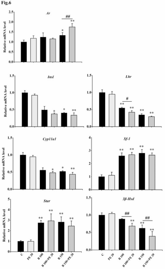 Effects of BPA and PE-MPs on steroidogenic related gene transcription levels in MLTC-1 cells. Note: Results are expressed as mean ± standard deviation (n = 3). *P < 0.05, **P < 0.01 indicate significant differences between the exposure group and the control. #P < 0.05, ##P < 0.01 indicates the significant differences between BPA and BPA + PE-MPs treatment group. |