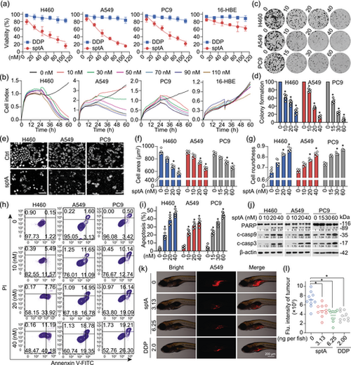 sptA inhibits growth and induces apoptosis in NSCLC cells. (a) The inhibitory effects of sptA on the growth of NSCLC cell lines and 16-HBE cells were evaluated with a CCK-8 assay (n = 5). (b) The inhibitory effects of sptA on the growth of NSCLC cell lines and 16-HBE cells were detected with an RTCA (n = 5). (c, d) Colony formation assays of NSCLC cell lines treated with sptA (n = 5). (e–g) Cell growth was assessed and imaged using high-content analysis (n = 5). The (f) area or (g) roundness of the cells was analysed using Harmony software (n = 5). Scale bar = 100 μm. (h, i) Cells were treated with sptA for 24 h and then asessed using annexin V/PI staining and flow cytometry (n = 5). (j) Cells were treated with sptA for 24 h, after which Western blot was performed (n = 5). (k, l) A549 xenograft zebrafish were treated with sptA or cisplatin at the indicated concentrations and observed at 2 dpi (n = 10). The intensity of red fluorescence is proportional to the tumour size. Data shown are individual values, with means ± SD. *P < 0.05, significantly different from control (0 nM sptA). DDP, cisplatin. |