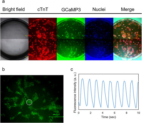 Characterization of GCaMP-hiCMs in vitro. Cryopreserved GCaMP-hiCMs were defrosted and cultured in vitro before transplantation. (a) Immunofluorescence staining for cardiomyocyte marker protein cTnT on day 7. Nuclei are stained with DAPI fluorescence. Scale bar = 200 μm. (b, c) Beating of GCaMP-hiCMs at 14 days after seeding in culture dishes. Vertical axis indicates intensity of fluorescence emission by cells in arbitrary units. White circle shows the analyzed area. cTnT, cardiac troponin T; DAPI, 4’,6-diamidino-2-phenylindole; GCaMP-hiCMs, genetically encoded fusion of green fluorescent protein with calcium-binding protein calmodulin expressed in human induced pluripotent stem cell-derived cardiomyocytes. (For interpretation of the references to colour in this figure legend, the reader is referred to the Web version of this article.) |