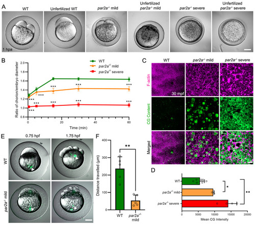 Maternal par2a mutant embryos display impaired egg activation events and cell division defects. A: Nomarski images of naturally fertilized and unfertilized, activated eggs from WT, mild and severe par2a mutant females. Chorion elevation and blastodisc formation are variably disrupted. B: Changes in the ratio of chorion lift to embryo size of naturally fertilized WT, mild and severe par2a mutant eggs at different time points over an hour postactivation, n=51; t-test; *** = p<0.001. C: Confocal images of F-actin (magenta) and cortical granule (CG Content; green) distribution in naturally fertilized WT (left), par2a mild (middle), and par2a severe (right) mutant eggs at 30 mpf. par2a mutants show retention of F-actin meshwork that correlates with retention of CGs at cortex. D: Quantification of CG content staining at cortex in fertilized WT, mild and severe par2a mutant eggs at 30 mpf. n = 7, 3, 4; Mann–Whitney test; * = p<0.05; ** = p<0.01. E: Fluorescent eGFP superimposed on Nomarski image of naturally fertilized WT and mild par2a mutants injected with fluorescent latex beads at the vegetal pole (left column). Bead movement is recorded 1 h later (right column). Arrowheads highlight latex bead position. F: Average distance traveled by injected fluorescent latex beads over 1 h in naturally fertilized WT and mild par2a mutant eggs. n = 5; Mann–Whitney test; ** = p<0.001. Scale bars: A, E = 200 µm; C = 20 µm. See file S1 Data for underlying data.