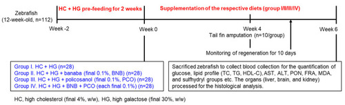 The study plan of a 6-week dietary intervention in zebrafish, incorporating a high-cholesterol (HC) and high-glucose (HG) diet infused with banaba (BNB), policosanol (PCO), or a combination of both (BNB+PCO). |