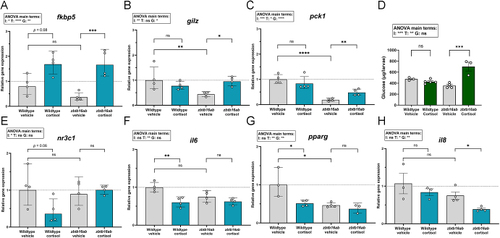Modulation of GR-mediated transactivation and transrepression of genes by zbtb16ab in zebrafish larvae. Five dpf WT zebrafish larvae and zbtb16ab crispants (n = 10–30) were treated with vehicle or 5 μg/mL cortisol for 20 h. Cortisol-induced GR target genes are indicated in the first panels at the upper row: (A) fkbp5 (P = 0.0002), (B) gilz (P = 0.01), (C) pck1 (P = 0.001). (D) Total glucose levels (mean ± S.E.M) from whole-body lysates of either 5 dpf WT zebrafish larvae or zbtb16ab crispants, with increased levels in the cortisol-treated crispants (P = 0.0002). The lower row shows the relative gene expression of GR-repressive genes: (E) nr3c1, (F) il6, (G) pparg, (H) il8 (P = 0.02). The relative gene expression was normalized to actb as a housekeeping gene. Data are presented in geometric means ± geometric S.D. G: genotype, I: interaction, ns: not significant, T: treatment.