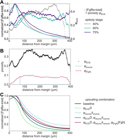 Using porosity profiles along the AV axis for upscaling in a 1D model. (A) Comparison of the ECS porosity (plus symbols, right y-axis) and [Fgf8a-total] profiles (lines, left y-axis) along the AV axis at different stages of epiboly (see key). In the first 100 μm from the margin, where the profile has a kink, ψECS approximately doubles. All profiles are computed at . (B) AV profiles of the ECS porosity, ψECS (black symbols); the source, ψsource (solid light-blue line); and the sink, ψ[Fgfr] (dashed pink line). All profiles are computed according to Eqn 15 by dividing the volume of the respective phase of interest by the total volume of the embedding spherical shell. (C) Upscaling SDD in porous ECS geometries. To disentangle the role of porous ECS heterogeneity in source, diffusion and sink on the formation of the AV gradient kink, we accounted for the AV profiles of ψECS, ψsource and ψ[Fgfr] by linearly scaling (1) DFgf8a and with ψECS (light-green line) and (2) fsource with ψsource (light-blue line), and by (3) combining (1) and (2) (dark-green line), and (4) combining (3) with scaling [Fgfr] with ψ[Fgfr] (pink line). The kink at the source is partly recovered when upscaling DFgf8a and fsource (case 3, dark-green line). All profiles are normalized by their maximum concentration and shown at .