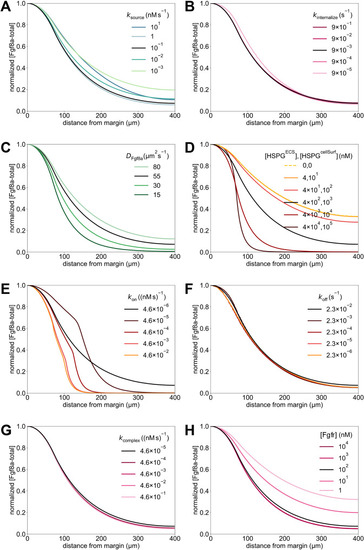 Sensitivity of a 1D model to variations in the model parameters. (A,B,G) Similar to the 3D model, the normalized simulated gradient shows robustness against changes in rates of source (A) and sink [i.e. kinternalize (B) and kcomplex (G)] (see key). (C,D) Changes in the effective diffusivity, by changing either the molecular diffusion coefficient of Fgf8a (C) or HSPG concentrations (D), strongly affect the gradient. The stronger the HSPG binding and the smaller the diffusion coefficient, the steeper and shorter the gradient. (E,F) Higher HSPG affinities (E) lead to shorter and steeper gradients with higher amplitude at the source (see absolute concentrations in Fig. S7E), whereas reducing HSPG unbinding rates (F) does not affect the gradient shape. (H) Compared to the baseline, decreasing [Fgfr] leads to flatter gradients, whereas increasing [Fgfr] has almost no effect on the gradient. This could be because of the HSPG binding that precedes Fgfr binding in our model, which could be the limiting step. For the baseline gradients, shown as a solid black line in all panels, the same parameters were used as in the 3D model (Table 2). All profiles are normalized by their respective maximum concentration. Profiles are shown at , which for complex internalization rates 100 times smaller and all HSPG binding rates larger than the baseline is before the gradient has reached steady state. This agrees with previous analytical solutions showing that steady state is reached slower for higher non-receptor binding (Lander et al., 2007) and smaller degradation rates (Berezhkovskii et al., 2010; Gordon et al., 2013).