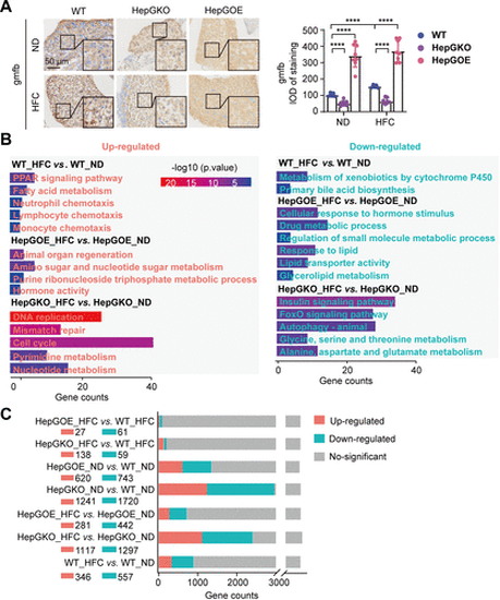 Transcriptome analysis of zebrafish in MASLD liver. A: representative anti-gmfb immunochemical images in liver slices from ND and HFC groups of WT, HepGKO, and HepGOE zebrafish, and quantification of the gmfb-positive staining density. Scale bar = 50 μm. n = 8 fish per group. Experiments were repeated on at least 3 clutches. One-way ANOVA, ****P < 0.0001 vs. ND or WT group. B: GO and KEGG analyses of transcriptome data associated with comparison of WT_HFC vs. WT_ND, HepGOE_HFC vs. HepGOE_ND, and HepGKO_HFC vs. HepGKO_ND. n = 2 samples for each group, 10 fish per sample. Significant functional entries were identified with criteria of P value < 0.05. C: bar plot shows the differential gene expression of transcriptome data defined with criteria of |log2(Fold Change)| > 1 and Padj < 0.05. n = 2 samples for each group, 10 fish per sample. gmfb, glia maturation factor-β; GO, Gene Ontology; hep-gmfb, gmfb in hepatocyte; HepGKO, hepatocyte-specific gmfb knockout; HepGOE, hepatocyte-specific gmfb overexpression; HFC, high fat, high cholesterol diet; IOD, integral optical density; KEGG; Kyoto Encyclopedia of Genes and Genomes; MASLD, metabolism-associated steatotic liver disease; ND, normal diet; WT, wild-type. |