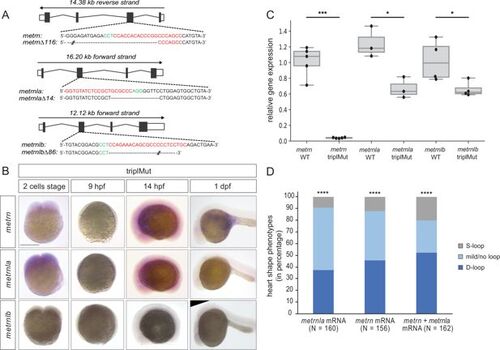 (A–C) Metrn genes CRISPR/Cas9 mediated knockout generation and validation. (D) Metrns loss-of-function effect on heart morphology. (A) Targeted metrns loci in the zebrafish genome for knockout generation. Red highlights the sgRNA homologous sequence, and PAM sequences are highlighted in green. The generated mutation is indicated below by dashed lines, and the number of deleted nucleotides is indicated after the D sign. (B) Metrn, metrnla, and metrnlb expression in triplMut embryos from two-cell stage to 1 day post fertilization (dpf) is highly reduced or undetectable by in situ hybridization (lateral views). (C) Metrns expression levels are reduced in triplMut embryos as shown by qRT-PCR analysis of metrn, metrnla, and metrnlb expression level at 14 hpf for metrn and metrnla and at 48 hpf for metrnlb in wild type (WT) and triplMut embryos. (Student t-test, ***p-value: 3.1e-06 for metrn; *p-value: 0.014 for metrnla; *p-value: 0.04 for metrnlb). Error bars indicate standard deviation. (D) Quantification in percentage of the number of embryos with S-looped, D-looped, or mild/no looped heart phenotypes at 2 dpf upon injection of metrnla mRNA, metrn mRNA, or both in triplMut embryos. Displayed p-values compared to WT: ****p-value:<1.0e-5 for metrnla mRNA, ****p-value:<1.0e-5 for metrn mRNA, ****p-value:<1.0e-5 for metrn +metrnla mRNA. Scale bar in (B) 250 μm. Source data for Figure 1—figure supplement 1 provided in “Figure 1—figure supplement 1—source data 1”.