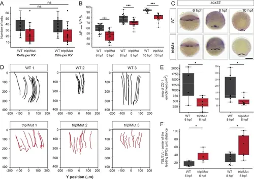 Metrns loss-of-function leads to DFC disorganization and migration defects. (A) The KV cilia number and cells per KV quantification in WT and triplMut embryos at 14 hpf show no significant difference between cilia number and KV cells (N WT: 23, N triplMut: 26, Student T-tests, n.s.: 0.67 for WT KV cells, 0.96 for triplMut KV cells). Error bars indicate standard deviation. (B) DFC migration quantification calculated as the percentage of the total embryo length at 6, 8, and 10 hpf in wild type (WT) vs. triplMut embryos. Per condition and group, 16–27 embryos were analyzed (Fisher exact test, ***p-value: 2.5e-06 for 6 hpf, ***p-value: 0.00038 for 8 hpf and ***p-value: 1.1e-08 for 10 hpf). Error bars indicate standard deviation. (C) Sox32 antisense riboprobe in situ hybridization highlighting DFC migration between 6 hpf and 10 hpf in WT and triplMut embryos (point line marks the margin of epiboly). All depicted images are dorsal views. (D) Single traces of in vivo tacked DFCs in WT control (upper panel) and triplMut (lower panel) showing the vegetal movement and convergence. (E) Quantification at 6 hpf (left plot) and 8 hpf (right plot) of DFC adjacent ZO-1 enrichment areas reveals a decrease in triplMut embryos in contrast to respective WT controls (T-test; 6 hpf *p-value: 0.043, 8 hpf *p-value: 0.028). Error bars indicate standard deviation. (F) The distance of the leading DFCs to the EVL is increased in triplMut compared to WT controls visualized at 6 hpf and 8 hpf (nested T-test, *p-value: 0.039 N=4 WT, 30 DFCs measured, triplMut N=6, 46 DFCs measured; for 6 hpf and *p-value: 0.021 N=7 WT embryos, 47 DFCs measured, N=7 triplMut, 54 DFCs measured for 8 hpf). Error bars indicate standard deviation. Scale bars: in (C) 0.25 mm. |