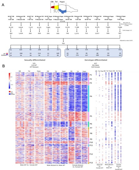 Workflow for BRB‐Seq data processing and heatmap of differentially expressed genes (DEGs) in the three different parts of the brain (olfactory bulb, telencephalon, and hypothalamus) on male and female WT and mutant adult fish. (A) Filtration steps based on limit of detection, fold change cut‐off of 1.5, and statistics leading to 703 DEGs. Hypo, hypothalamus; OB, olfactory bulb; Tel, telencephalon. (B) Heatmap of all DEGs in each WT and mutant fish in the three areas of the brain. Genes are clustered in 13 distinct patterns: P1. 36 DEGs, P2. 31 DEGs, P3. 27 DEGs, P4. 213 DEGs, P5. 74 DEGs, P6. 43 DEGs, P7. 15 DEGs, P8. 66 DEGs, P9. 24 DEGs, P10. 23 DEGs, P11. 19 DEGs, P12. 120 DEGs, P13. 12 DEGs. On the right‐hand side of the heatmap, each dysregulated gene is represented as a tile, with a color intensity reflecting the average log2 fold change of samples for each comparison and brain region. Scale: Log2 fold change. Red = significantly upregulated expression, Blue = significantly downregulated expression, White = no significant change. Male:  |
