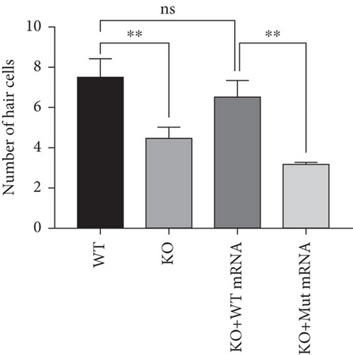 Characterization of prps1a gene editing and phenotypic analysis in zebrafish. (a) Schematic of the zebrafish prps1a gene structure, highlighting the gRNA target sites. Arrows indicate gRNA binding sites, with exons represented as boxes. (b) Sequencing analysis of mutations induced by the two gRNAs showing various mutation types, including insertions, deletions, and substitutions. (c) Validation of gRNA activity through cleavage assays, assessing the efficiency of double-strand break induction by each gRNA. (d) Hair cell staining in zebrafish larvae across four experimental groups: wild-type (WT), gene KO, KO with wild-type mRNA injection (KO+WT mRNA), and WT with Cys165Tyr mutant mRNA injection (WT+Cys165Tyr). Scale bar = 200  μm. (e) Confocal microscopy images of hair cells in zebrafish larvae from different experimental groups showing structural integrity and localization. Scale bar = 20  μm. (f) Quantification of hair cells in different experimental groups. (g) Behavioral tracking of zebrafish larvae, recording movement patterns to assess the impact of prps1a gene editing on behavior. (h) Line graph of swimming distance of zebrafish with different genotypes under noise. (i) Statistical analysis of behavioral data of total distance. (j) Statistical analysis of behavioral data of first distance. (k) Representative microscopic images of hair cells stained with AO in zebrafish larvae from different experimental groups. Scale bar = 100  μm. (l) Quantification of fluorescence intensity in hair cells of the larvae. Data were compared using ANOVA followed by post hoc tests, with significant differences indicated (p < 0.05). Data are presented as mean ± SD.  ∗p < 0.05,  ∗∗p < 0.01,  ∗∗∗p < 0.001, and  ∗∗∗∗p < 0.0001.