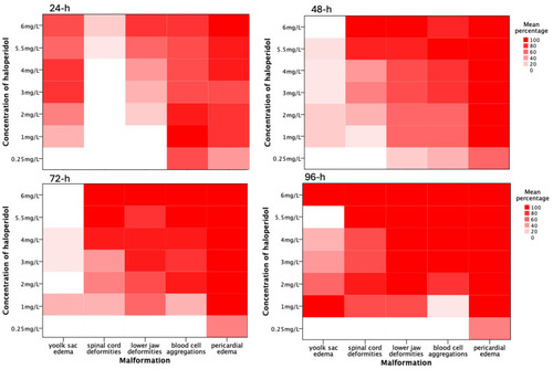 Heatmap of various malformations exposed to various concentrations of haloperidol up to 96 h of exposure. |