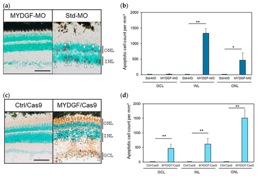 Suppression of MYDGF expression after ONI increased the number of apoptotic cells in the retina and disrupted the retinal layer structure. (a) Injection of MYDGF-specific MO (MYDGF-MO) significantly increased the number of red-stained apoptotic cells 3 h after ONI (white arrowhead); in comparison, no apoptotic cells were observed in the control-MO (Std-MO) injection group. (b) Apoptotic cells were quantified as the number of apoptotic-positive cells per mm2 in the retina. (c) Administration of MYDGF-specific sgRNA via the CRISPR/Cas9 system (MYDGF/Cas9) also significantly increased the number of red-stained apoptotic cells (white arrowhead), and most of the photoreceptors were stained red in the ONLs. No apoptotic cells were observed in the control/Cas9 injection group (Ctrl/Cas9). (d) Apoptotic cells in the retina were quantified as the number of apoptotic cells per mm2 following CRISPR/Cas9 system administration. Each nuclear layer of the retina was stained with 3% methyl green for counterstaining. Data are presented as the mean ± SEM (n = 5–6) of three independent experiments and were analyzed using one-way ANOVA. Statistical significance was set at ** p < 0.01 and * p < 0.05. ONL: outer nuclear layer; INL: inner nuclear layer; GCL: ganglion cell layer. Scale bar = 50 µm