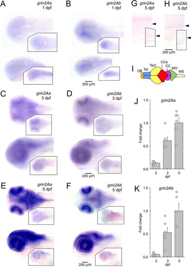 Expression of grin2Aa and grin2Ab in the zebrafish nervous system. Whole-mount ISH of grin2Aa and grin2Ab at 1 dpf (A, B), 3 dpf (C, D), and 5 dpf (E, F) showing dorsal (top) and lateral (bottom) views. A, C, E, Insets, sense probes of grin2Aa. B, D, F, Insets, sense probes of grin2Ab. G, H, Lateral view of the trunk at 5 dpf for grin2Aa (G) and grin2Ab (H). The position of the spinal cord is indicated by arrows. Insets, Sense probes of grin2Aa and grin2Ab. I, Simplified representation of the zebrafish central nervous system and its major structures. Adapted from Wullimann et al. (1996); CC, crista cerebellaris; CCe, corpus cerebelli; MO, medulla oblongata; MS, medulla spinalis; OB, olfactory bulb; Tel, telencephalon; TeO, tectum opticum. J, K, Relative expression levels of grin2Aa and grin2Ab mRNA at 2 dpf (n = 6; 6), 3 dpf (n = 6; 6), and 5 dpf (n = 6; 5) in the head of zebrafish larvae analyzed using RT-qPCR. Results are normalized to the corresponding gene expression at 5 dpf. For mRNA expression levels of grin1 and grin2B paralogs in the zebrafish nervous system, see Extended Data Figure 2-1.