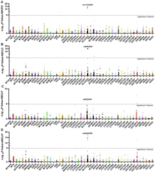 Association analysis of SNPs in environmental related genes. A–D Association results for SNPs in folate metabolism, vitamin A/C/D/E, nicotine metabolism, alcohol metabolism and hypoxia related genes in NSCPO, NSCLO, NSCLP and NSCL/P respectively. SNP, single nucleotide polymorphism. NSCPO non-syndromic cleft palate only |