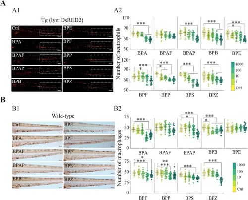 Effects of BPA and its analogs on the number of innate immune cells in zebrafish embryos at 72 hpf. (A) The number of neutrophils in Tg (lyz: DsRED2) zebrafish embryos; A1, representative fluorescence images of neutrophils from the control and 1000 μg/L bisphenol treatment groups; the white rectangle shows the caudal hematopoietic tissue (CHT) area in the tail of the embryos; A2, statistical maps of the number of neutrophils in the CHT region. (B) The number of macrophages in wild-type AB zebrafish embryos; B1, representative images of neutral red-labeled macrophages from the control and 1000 μg/L bisphenol treatment groups; B2, statistical analysis of macrophages. The results are shown as the mean ± SDs (n ≥ 20). Significant differences between bisphenol treatments and controls are denoted by asterisks (*p < 0.05, ** p < 0.01, *** p < 0.001). Scale bars represent 500 μm (A1) and 200 μm (B1). |