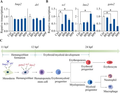 Effects of BPA, BPB, BPF, and BPP on hemangioblast formation during zebrafish development. qPCR analysis showing the transcriptional levels of the marker genes bmp2 and drl for the mesoderm (A) as well as scl, lmo2, and gata2 for hematopoietic progenitors (B) in embryos exposed to 1000 μg/L BPA, BPB, BPF, and BPP at 12 hpf. A schematic diagram of hematopoiesis during early zebrafish development shows that BPA, BPB, BPF, and BPP repressed the formation of anterior hemangioblasts (C); significantly affected end points are marked in red, whereas unaffected end points are marked in blue. The results are shown as the means ± SDs (n = 3). Significant differences between bisphenol-treated and control groups are denoted by asterisks (p < 0.05). |