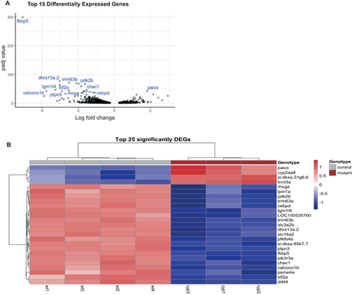 Differential gene expression in cyp21a2−/−larvae. (A) Volcano plot showing the top 25 DEGs in cyp21a2−/− larvae, with statistical significance (P-adj) represented on the vertical axis and the LFC on the horizontal axis. (B) Heatmap and table indicating the top 25 DEGs in cyp21a2−/− larvae. |