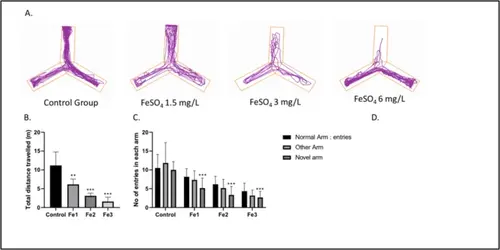 Ferrous Sulphate (1.5, 3, and 6 mg/L) impaired the locomotion pattern and memory in the Y maze test (A) Illustration of representative locomotion tracking pattern of the Control group and FeSO4 (1.5, 3, and 6 mg/L) treated groups. Here, 1: Start Arm; 2: Other Arm and; 3: Novel Arm (B) Graphical representation of the total distance travelled in different groups. (C) Graphical representation of the No. of entries of the zebrafish in each arm (Normal arm (start arm), Other arm and Novel arm. Data are represented as means ± S.E.M. (n = 10). For Bonferroni’s post hoc analyses: (B) Control vs. Fe1(1.5 mg/L): ** p < 0.001, Control vs. Fe2(3 mg/L): *** p < 0.0001, Control vs. Fe3(6 mg/L): *** p < 0.0001. (C) For Novel arm: Control vs. Fe1(1.5 mg/L): *** p < 0.0001, Control vs. Fe2(3 mg/L): *** p < 0.0001, Control vs. Fe3(6 mg/L): *** p < 0.0001. (D) Control vs. Fe1(1.5 mg/L): *** p < 0.0001, Control vs. Fe2(3 mg/L): *** p < 0.0001, Control vs. Fe3(6 mg/L): *** p < 0.0001