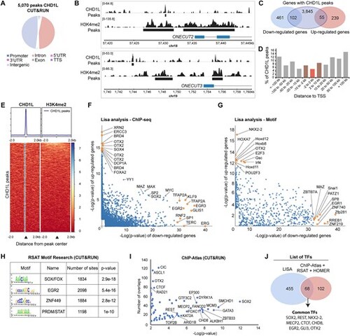 Characterization of CHD1L binding in hNPC. (A) Pie chart of the genomic distribution of CHD1L CUT&RUN peaks in control hNPC. (B) Examples of CHD1L-bound sites located upstream of downregulated genes ONECUT2 and ONECUT3. (C) Venn diagram showing CHD1L-bound genes that are downregulated or upregulated in CHD1L mutant hNPC. (D) CHD1L Peak distribution from TSS. (E) Tag density map of CHD1L and H3K4me2 CUT&RUN peaks, ± 2 kb from the CHD1L peak center and corresponding average tag density profiles. (F, G) Lisa results showed as pairwise scatterplots for comparison of the two gene sets (downregulated and upregulated genes in absence of CHD1L in hNPC) based on TF ChIP-seq and TF motifs respectively. The top 10 TFs are shown in yellow. (H, I) RSAT-based motif enrichment analysis and ChIP-Atlas comparison of CHD1L CUT&RUN data, respectively. (J) Venn diagram showing common TFs predicted by Lisa, ChIP-Atlas, RSAT, and HOMER analyses. |