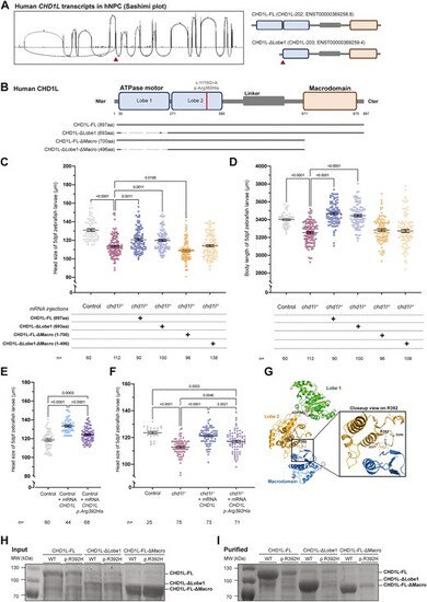 CHD1L function is mediated through its macrodomain and is implicated in neurodevelopmental disorders. (A) Sashimi plot of CHD1L mRNA transcripts expressed in hNPC showing two main isoforms corresponding to CHD1L-202 (ENST00000369258.8) and CHD1L-203 (ENST00000369259.4). (B) Schematic representation of the human protein isoforms of CHD1L including CHD1L-FL (CHD1L-202), CHD1L-ΔLobe1 (CHD1L-203), and two truncated forms of CHD1L (CHD1L-FL-ΔMacro and CHD1L-ΔLobe1-ΔMacro). The homozygous variant p.Arg392His is shown on the protein. (C) Dot plot showing the distance between the eyes (head size) of 5 dpf control larvae and larvae injected with mRNA for each of the two isoforms and the two truncated forms of CHD1L. Data shown as mean ± SEM of triplicate batches; Kruskal–Wallis test performed between chd1l−/- alone versus all the other conditions. (D) Dot plot showing the body length of 5 dpf control larvae and larvae injected with mRNA for each of the two isoforms and the two truncated forms of CHD1L. Data shown as mean ± SEM of triplicate batches; ordinary one-way ANOVA performed between chd1l−/- alone versus all the other conditions to validate phenotypic rescue. (E) Dot plot showing the distance between the eyes (head size) of 5 dpf control larvae or larvae injected with human CHD1L-FL mRNA either WT or carrying the mutation p.Arg392His. Data shown as mean ± SEM of triplicate batches; ordinary one-way ANOVA. (F) Dot plot showing the distance between the eyes (head size) of 5 dpf control, noninjected chd1l mutant larvae and chd1l mutant larvae injected with the human CHD1L-FL mRNA either WT or carrying the mutation p.Arg392His. Data shown as mean ± SEM of triplicate batches; ordinary one-way ANOVA. (G) Ribbon representation of the structure of the self-inhibited form of CHD1L (PDB entry 7epu) in full (left panel) and with a closeup on the region harboring Arg392 residue (boxed right panel). Arg392 structures a specific region of CHD1L ATPase lobe 2 (orange) by interacting with main chain carbonyls and aspartate side chains. This region is key in interacting with the CHD1L macrodomain (blue) in the inhibited form. (H) Total protein expression levels in E. coli of the three constructs used in this study. No significant changes are observed between the WT and p.Arg392His constructs. (I) Levels of the soluble CHD1L constructs from panel (H). The p.Arg392His mutation causes a major decrease of the solubility of CHD1L constructs, irrespective of the construct considered. |