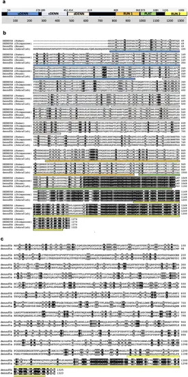 Multiple sequence alignments of dennd5b amino acid sequences. a The protein domains of zebrafish Dennd5b, including uDENN, cDENN, dDENN, RUN1, PLAT, and RUN2, are illustrated in a schematic representation. The gray line beneath the schematic denotes the positions of the amino acid residues, while the lighter gray line above the schematic marks the specific locations of the individual domains b The amino acid sequence alignment shows the high level of conservation of DENND5B between humans, chimpanzees, mice, and zebrafish. Amino acids highlighted in black shade indicate conservation of the residue between all proteins, those in grey reflect highly similar residues between proteins. Below the amino acid sequences, the blue line represents the position of the uDENN domain, while the light blue lines indicate the central DENN domain. The light pink line corresponds to the dDENN domain. The dark yellow lines denote the locations of the first RUN domain (RUN1), and the light yellow lines mark the second RUN domain (RUN2). Additionally, the green lines represent the PLAT domain, which separates the two RUN domains within DENND5B c Amino acid sequence alignments between zebrafish dennd5a and dennd5b, and light-yellow lines indicate the locations of the RUN2 domain in zebrafish dennd5b |