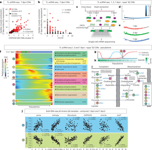 Cardiomyocyte proliferation is separated in time from OXPHOS and cardiomyocyte re-differentiation. a,b, Positive correlation of cardiac muscle contraction genes in cardiomyocytes to OXPHOS (a) but not to proliferation marker mcm5 (b) by reanalyzing previous scRNA-seq data from Honkoop et al.13. Red indicates border zone cardiomyocytes; clusters are as in the original publication. c, Schematic diagram of the scRNA-seq procedure using the transgenic TgBAC(nppa:mCitrine) line to FACS 1 dcpi, 3 dcpi and 7 dpci border zone cardiomyocytes. d, Timeline generated by pseudotime analysis of the 1 dcpi, 3 dcpi and 7 dpci border zone cardiomyocytes. e, Pseudotime analysis recapitulates the real-time order of the samples. f, Differentially expressed genes changing over pseudotime, grouped into eight modules using unsupervised hierarchical clustering. Each module was analyzed for enriched processes. g, Schematic to indicate how levels of OXPHOS and Cell cycle genes alternate. h, StemID analysis shows that the cardiomyocytes differentiate along the pseudotime. i, Sequential activation of Glycolysis, TCA cycle, MAS and OXPHOS genes based on pseudotime analysis. j, Correlation graphs of strain bulk RNA-seq data comparing significantly expressed genes in modules 3 and 6 with proliferation (pcna), differentiation state (entropy), Glycolysis, OXPHOS, tnnc1 (correlates to border zone embcmhc expression) and myl7 (mature cardiomyocyte marker). Data showing positive correlation between proliferation and de-differentiation with module 3 but negative correlation to module 6. OXPHOS and myl7 have the opposite pattern. Embryonic border zone marker tnnc1a only positively correlates to module 6 and, thus, the re-differentiation stage. d–f,h, n = 4 hearts per timepoint. a,b,j, Simple linear regression. BZ, border zone; CM, cardiomyocyte; RZ, remote zone.