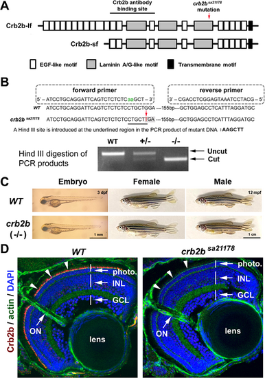 crb2bsa21178 mutation eliminates Crb2b expression in the retina with no gross defects. (A) The position of crb2bsa21178 mutation and the Zou anti-Crb2b antibody binding site in the extracellular domains of the Crb2b-lf and Crb2b-sf. The EGF-like, laminin A/G-like transmembrane motifs are illustrated as shaded boxes. (B) The strategy to genotype wild-type (WT) and crb2bsa21178 mutant (–/–) fish by PCR and Hind III digestion. (C) crb2bsa21178 mutant fish showed no apparent differences in body shape at 3 dpf and adulthood compared to the wild-type. (D) Crb2b immunostaining signals (red, arrowheads) were eliminated in crb2bsa21178 homozygous mutant retina at 5 dpf. The photoreceptor layer (photo), inner nuclear layer (INL), ganglion cell layer (GCL), lens, and optic nerve (ON) were revealed by phalloidin staining of actin and DAPI staining of the cell nuclei. |