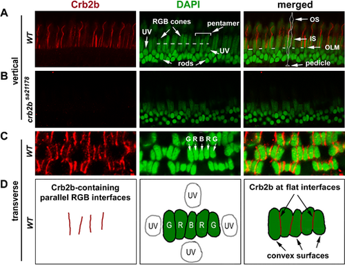 Crb2b localization in the pentamers of RGB cones in 12-mpf retina. (A) Crb2b immunostaining (red) of radial sections of the wild-type photoreceptor layer. The DAPI staining (green) revealed the differences in staining intensities and positioning among the photoreceptor nuclei: lightly stained and more apical positioned long RGB cone nuclei; lightly stained round UV cone nuclei immediately basal to the outer limiting membrane (OLM, the dashed line in the merged panel); and intensively stained smallest rod nuclei at the basal half of the outer nuclear layer. The dashed line in the green panel indicates the position where pentamers were examined at the transverse plane (see panels C, D). A pentamer, flanked by two UV cones, is indicated by a bracket. In the merged image panel, an RGB cone is contoured to show its general polarized morphologies, with its pedicle, inner segment (IS), and outer segment (OS) indicated by arrows. (B) No Crb2b signals (red) were detected in homozygous crb2bsa21178 mutant retinas (radial section). (C, D) Crb2b immunostaining (red) of a transverse section of the photoreceptor layer revealed that Crb2b localized to the junctional interfaces between RGB cones of pentamers, as depicted by the diagrams in D. Note the lack of Crb2b signals at the adjacent convex cell surfaces. |