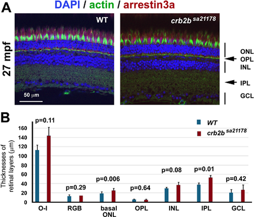 The apicobasal polarization of the retina and photoreceptors remains largely intact in crb2bsa21178 homozygous mutants at 27 mpf. (A) Staining of actin (green, by phalloidin), nuclei (blue, by DAPI), and arrestin-3a (red, by the Zpr1 antibody) retinal layers: ONL, outer nuclear layer; OPL, outer plexiform layer; INL, inner nuclear layer; IPL, inner plexiform layer; GCL, ganglion cell layer. Images were taken from the central retinal regions. (B) The thicknesses of retinal layers of the wild-type and crb2bsa21178 homozygous mutants. O-I, distance between the outer limiting membrane and the inner limiting membrane; RGB, thickness of the RGB nuclear layer; basal ONL, thickness of the outer nuclear layer region that is basal to the outer limiting membrane. Student's two-tailed and paired t-tests were used to compare the differences in retinal layer thicknesses between the wild-type and mutant samples (n = 4 fish). |