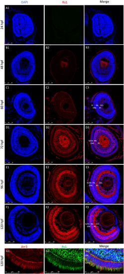 The spatiotemporal overview of retinoschisin (Rs1) protein presence during the first five days of retinal development shows that Rs1 protein presence is first detected at 48 hpf and increases in intensity and spatial distribution up to 120 hpf. Cryosections were incubated with primary antibodies overnight at 4°C. At least 3 biological replicates were examined per timepoint. A: No positive immunostaining of Rs1 was observed within the first 24 h of retinal development. B: At 48 h, Rs1 protein presence was first observed in this experiment in low levels in the ganglion cell layer (GCL). C: At 60 hpf, a weak signal was detected in the GCL, the inner plexiform layer (IPL), and the outer nuclear layer (ONL) D‐E. The intensity of Rs1 immunostaining continued to increase throughout 72 (D), 96 (E), and 120 (F) hpf. G. Co‐staining of Rs1 and cone arrestin (Arr3) demonstrated that Rs1 surrounds the developing outer segments at 120 hpf. F. Rs1 presence was quantified per retinal layer and normalized to total Rs1 signal per sample. Data represent mean percentage of Rs1 signal per layer (± standard error of the mean). A shift in Rs1 localization is observed from predominately INL at 72 hpf toward increasing IPL and GCL contribution at later stages. Hpf = hours post fertilization, Rs1 = retinoschisin, Arr3 = cone arrestin, DAPI = 4′,6‐diamidino‐2‐phenylindole.