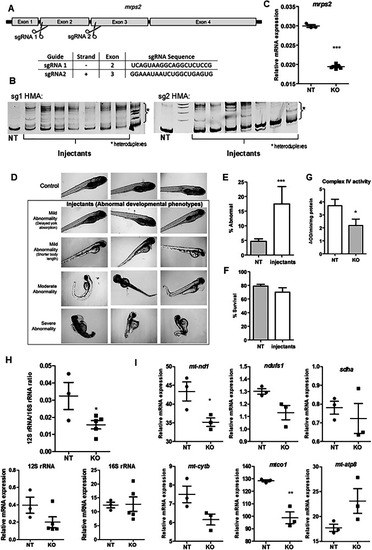 Phenotypes in the mrps2 knockout zebrafish larvae. A A schematic of the zebrafish mrps2 with the location of the selected sgRNA target sites indicated. The sequences of the two sgRNAs used in the study are provided in the table, B Assessment of editing efficiency for each sgRNA at 24 h post injection, by a heteroduplex mobility assay (HMA), C Relative expression levels of the mrps2 mRNA in the controls and injectants (crispants), D Representative bright field images of wild-type and mrps2 crispants (at 3dpf) illustrating abnormal developmental phenotypes observed in the crispants, as labeled, E, F Quantification of the number of larvae showing abnormal development at 5dpf (E) and survival at 7dpf (F) (5 experiments, NT n = 560, KO n = 820), G Complex IV activity measurement in mitochondria isolated from control and mrps2 crispants, H 12S to 16S rRNA ratio in the crispants compared to controls. Results from 3 to 5 independent experiments are quantified, and error bars represent SEM, (I) Relative mRNA levels of OXPHOS subunits genes including nd1, ndufs1 (Complex I), sdha (Complex II), cytb (Complex III), mt-co1 and mt-co2 (Complex IV), in the mrps2 crispants compared to controls.