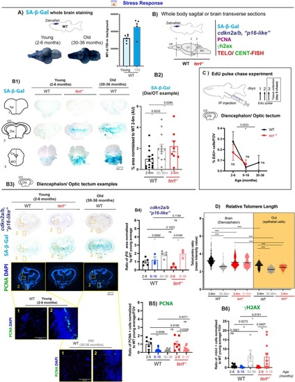 Telomerase (tert) depletion accelerates ageing‐associated stress response in the zebrafish brain. Brain tissue collected from 2–6 months, 9–16 months and 30–36 months WT fish, and 2–6 months and 9–16 months tert−/− fish were used to assess stress response by SA‐β‐Gal staining, cdkn2a/b (‘p16‐like’) RNA expression, proliferation (PCNA and EDU staining), telomere length and DNA damage. (A) Whole brain SA‐β‐Gal staining in young and old WT fish and respective quantification show an increased expression of SA‐β‐Gal in old WT brains compared to young ones. N = 5–6 per group. (B) Schematic figure showing the regions of the brain assessed for senescence‐associated markers. (B1) Representative images of SA‐β‐Gal staining in coronal cryosections of WT and tert−/− zebrafish show that there is an increased expression of SA‐β‐Gal in old WT zebrafish (30–36 months) and that a similar pattern is observed in tert−/− at the young age of 2–6 months, particularly in the diencephalon and optic tectum for which (B2) quantifications are shown. N = 8–14 per group. (B3) Representative images from in situ hybridisation in coronal cryosections, show an increased expression of cdkn2a/b (‘p16‐like’) in WT zebrafish > 30 months optic tectum and diencephalon, in areas where SA‐β‐Gal expression is observed. This increase in p16 expression is already significant at 9–16 months of age in tert−/−. Quantifications shown in B4. N = 3–5 per group. (B3) Representative images of PCNA and γH2AX staining in adjacent sections from zebrafish brain, in coronal cryosections. (B5) Proliferation assessed by PCNA staining show a decrease in proliferation with ageing in both WT and tert−/− fish but this is not accelerated in the absence of telomerase. N = 3–7 per group. (B6) DNA damage response assessed by γH2AX staining show increased DNA damage in WT fish 30–36 months, this increase is accelerated in the tert−/− fish from 9–16 months age. N = 3–7 per group. (C) Similar to what was observed by PCNA staining, proliferation assessment by EdU staining after a 3‐day pulse experiment show a decrease in proliferation with ageing in both WT and tert−/− brains, but this is not accelerated in the absence of telomerase. N = 3–7 per group. (D) Relative telomere length, assessed by telo/cent‐FISH, in longitudinal paraffin sections of zebrafish brain (white) and gut (yellow), show that telomere length decreases with ageing in WT fish (30–36 months) and that this is accelerated in young tert−/− fish (2–6 months). N = 4–5 per group. (A, B2, B4, B5, B6) Each dot represents one animal. (D) Each dot represents one cell. Error bars: SEM. *p < 0.05; **p < 0.01; ***p < 0.001. Abbreviations: OB, olfactive bulb; Tel, telencephalon; Die, diencephalon; OT, optic tectum; Ce, cerebellum; MO, medulla oblongata.