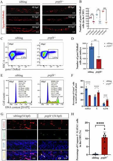 prpf4 deficiency reduces the number of erythrocytes in zebrafish. A, B The number of erythrocytes in the CHT region of siblings and prpf4−/− embryos was assessed using confocal microscopy in Tg(gata1:DsRed) transgenic zebrafish. Scale bar: 100 µm. C, D FACS analysis of GATA1+ erythrocytes from siblings and prpf4−/− mutants at 48 hpf. C In prpf4 mutants, the proportion of GATA1+ erythrocytes was reduced (30 embryos per group). D Quantitative analysis of GATA1+ erythrocyte numbers in individual embryos. E Cell cycle analysis of GATA1+ erythrocytes from siblings and prpf4−/− mutants at 48 hpf (30 embryos per group). F Quantification of the percentage of cells in each cell cycle phase. G, H Confocal microscopy analysis of apoptosis in GATA1+ erythrocytes in the CHT region of siblings and prpf4−/− embryos at 54 hpf. G Immunofluorescence staining showing GATA1 (red), active Caspase-3 (green), and DAPI (blue). Arrows indicate apoptotic GATA1+ cells. Scale bar: 50 µm. H Quantitative analysis shows a significantly higher proportion of apoptotic GATA1+ cells in the CHT region of prpf4−/− embryos compared with siblings.