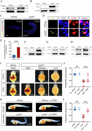 Activating of the DDR-ATM/Chk2-p53 signaling pathway disrupts erythropoiesis in prpf4 mutants. A, B Western blot analysis for RNA:DNA hybrid accumulation and DNA damage in 54 hpf embryos. A S9.6 antibody detected higher RNA:DNA hybrid levels in prpf4−/− embryos than in siblings. B γH2AX levels are significantly increased in prpf4−/− embryos compared with siblings. C–E Analysis of DNA damage in GATA1+ erythrocytes in 54 hpf embryos. C Confocal images show γH2AX staining in the CHT region of siblings and prpf4−/− embryos. Scale bar: 200 µm. D High-magnification images of erythrocytes show the colocalization of γH2AX and GATA1. Scale bar: 50 µm. E Quantification of the percentage of γH2AX-positive cells among GATA1+ cells in the CHT region. F-H Western blot analysis of the activation of P53 and checkpoint kinase signaling in 54 hpf embryos. F Increased P53 protein levels are observed in prpf4−/− embryos compared with siblings. G p-Chk1 protein levels show no significant changes between prpf4−/− embryos and siblings. H p-Chk2 protein levels are increased in prpf4−/− embryos compared with siblings. I, J Effect of the specific kinase inhibitor ATMi (KU60019) on erythrocyte hemoglobin levels in prpf4−/− embryos at 48 hpf. I O-dianisidine staining intensity in DMSO-treated siblings, prpf4−/− embryos, and ATMi-treated prpf4−/− embryos. Scale bar: 100 µm. J Quantitative analysis of o-dianisidine staining intensity. ATMi-treated prpf4−/− embryos show significantly higher staining intensity compared to DMSO-treated prpf4−/− embryos. K, L Effect of p53 knockdown on erythrocyte hemoglobin levels in prpf4−/− embryos at 48 hpf. K Knockdown of p53 in prpf4−/− embryos significantly increased hemoglobin levels, as indicated by stronger o-dianisidine staining. Scale bar: 200 µm. L Quantitative analysis of o-dianisidine staining intensity.