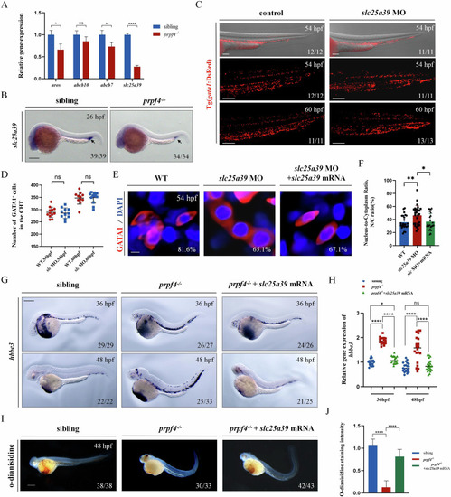 slc25a39 downregulation in prpf4 mutants blocks erythrocyte maturation. A RT-qPCR analysis of gene expression in GATA1+ erythrocytes at 48 hpf. B Expression of slc25a39 in siblings and prpf4−/− embryos at 26 hpf, detected by in situ hybridization. Scale bar: 200 µm. C, D Effect of slc25a39 knockdown on GATA1+ erythrocytes in Tg(gata1:DsRed) embryos. C Confocal images showing GATA1+ cells in the CHT region of control and slc25a39 MO-injected embryos at 54 hpf and 60 hpf. Scale bar: 100 µm. D Quantification of the number of GATA1+ cells in the CHT region. E, F Effect of slc25a39 knockdown on erythrocytes morphology in Tg(gata1:DsRed) embryos at 54 hpf. E Confocal images showing the morphology of GATA1+ cells in control, slc25a39 MO-injected, and slc25a39 MO + mRNA co-injected embryos. Scale bar: 20 µm. F Quantitative analysis of the nuclear-to-cytoplasmic (N/C) ratio of individual cells measured from (E). WT (n = 25), slc25a39 MO (n = 27), slc25a39 MO + mRNA (n = 24). G WISH analysis of hbbe3 at 36 hpf shows the staining patterns in sibling, prpf4−/−, and prpf4−/− embryos co-injected with slc25a39 mRNA. Scale bar: 200 µm. H Quantification of hbbe3 staining intensity in the CHT region at 36 hpf reveals significantly higher staining intensity in prpf4−/− embryos compared with sibling embryos. Co-injection of slc25a39 mRNA significantly reduces the staining intensity in prpf4−/− embryos. I, J Effect of slc25a39 mRNA injection on hemoglobin levels in prpf4−/− embryos at 48 hpf. I Images of o-dianisidine staining in WT, prpf4−/−, and prpf4−/− embryos injected with slc25a39 mRNA. Scale bar: 200 µm. J Quantification of o-dianisidine staining intensity. Hemoglobin levels are significantly reduced in prpf4−/− embryos compared with WT, while slc25a39 mRNA injection partially restores hemoglobin levels in prpf4−/− embryos. Scale bar: 100 µm.