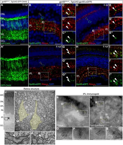Gpr85 is enriched in the pre- and postsynaptic compartments of developing and adult IPL retinal ribbon synapses. A, Maximum projection confocal images of the retina from a gpr85GAL4/+, Tg(UAS:GFP-CAAX) adult zebrafish stained with anti-GFP (green) and DAPI (blue). (N = 3) Scale bar, 50 µm. B–I, Confocal images of coronal retinal sections from 6 dpf (B–E″) or 6 mpf (F–I″) gpr85GAL4/+, Tg(UAS:gpr85-eGFP) zebrafish stained with anti-GFP (green), anti-Ribeye-A (red), and DAPI (blue). B, F, Larval or adult Gpr85-eGFP+ AC somas and signal within the IPL are shown, with boxed regions enlarged in C-C″ and G-G″, respectively. White arrowheads highlight Gpr85-eGFP signals adjacent to Ribeye+ ribbon terminals. D, H, Larval or adult Gpr85-eGFP+/Ribeye-A+ BPC ribbon presynaptic terminals are shown, with boxed regions enlarged in E-E″ and I-I″, respectively. White arrowheads show examples of Gpr85-eGFP signal present in Ribeye+ ribbon terminals. (N = 3) Scale bars, (B, D) 25 µm, (F, H) 50 µm, (C, E, G, I) 10 µm. J, Electron microscopy coronal view of the structure of 6 dpf retina from gpr85GAL4/+, Tg(UAS:gpr85-mCherry) zebrafish larvae. (N = 3) Scale bar, 10 µm. K, Enlarged image of the ribbon presynaptic terminals (yellow) from the boxed area in panel J. Scale bar, 1 µm. L, M, Enlarged images of synaptic boutons from the boxed area in panel K. White arrowheads highlight postsynaptic densities while black arrowheads point to presynaptic vesicles. Scale bars, 200 nm. N–S, Immunogold labeling of Ribeye (N–P) and mCherry-tagged Gpr85 (Q–S) focusing on the retinal inner plexiform layer from 6 dpf gpr85GAL4/+, Tg(UAS:gpr85-mCherry) larvae. Dashed yellow lines highlight plasma membranes. Boxes indicate regions enlarged in panels O, P, R, and S. Scale bars, 200 nm. dpf, days postfertilization; mpf, months postfertilization; ONL, outer nuclear layer; OPL, outer plexiform layer; INL, inner nuclear layer; GCL ganglion cell layer.