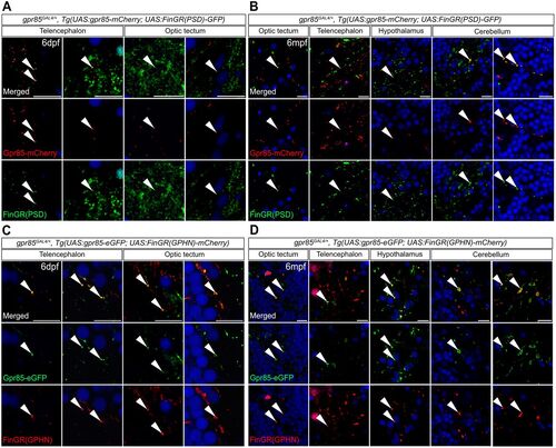 Gpr85 is enriched at the level of excitatory and inhibitory synaptic inputs of gpr85-expressing neurons throughout the developing and adult brain. A, Confocal images of coronal brain sections from 6 dpf gpr85GAL4/+, Tg(UAS:gpr85-mCherry; UAS:FinGR(PSD)-GFP) larvae stained with anti-GFP (green), anti-mCherry (red), and DAPI (blue). White arrowheads show examples of Gpr85-mCherry signal localized at the level of PSD+ excitatory synapses in the Tel and TeO. Scale bar, 10 µm. B, Confocal images of coronal brain sections from 6 mpf gpr85GAL4/+, Tg(UAS:gpr85-mCherry; UAS:FinGR(PSD)-GFP) adult zebrafish stained with anti-GFP (green), anti-mCherry (red), and DAPI (blue). White arrowheads show examples of Gpr85-mCherry signal localized at the level of PSD+ excitatory synapses in the indicated brain regions. Scale bar, 10 µm. C, Confocal images of coronal brain sections from 6 dpf gpr85GAL4/+, Tg(UAS:gpr85-eGFP; UAS:FinGR(GPHN)-mCherry) larvae stained with anti-GFP (green), anti-mCherry (red), and DAPI (blue). White arrowheads highlight examples of Gpr85-eGFP signal present at the level of the GPHN+ inhibitory synapses in the Tel and TeO. Scale bar, 10 µm. D, Confocal images of coronal brain sections from 6 mpf gpr85GAL4/+, Tg(UAS:gpr85-eGFP; UAS:FinGR(GPHN)-mCherry) adult zebrafish stained with anti-GFP (green), anti-mCherry (red), and DAPI (blue). White arrowheads highlight examples of Gpr85-eGFP signal present at the level of the GPHN+ inhibitory synapses of the indicated brain regions. Scale bar, 10 µm. (for all N = 3) dpf, days postfertilization; mpf, months postfertilization. GPHN, Gephyrin; PSD, postsynaptic density protein 95.