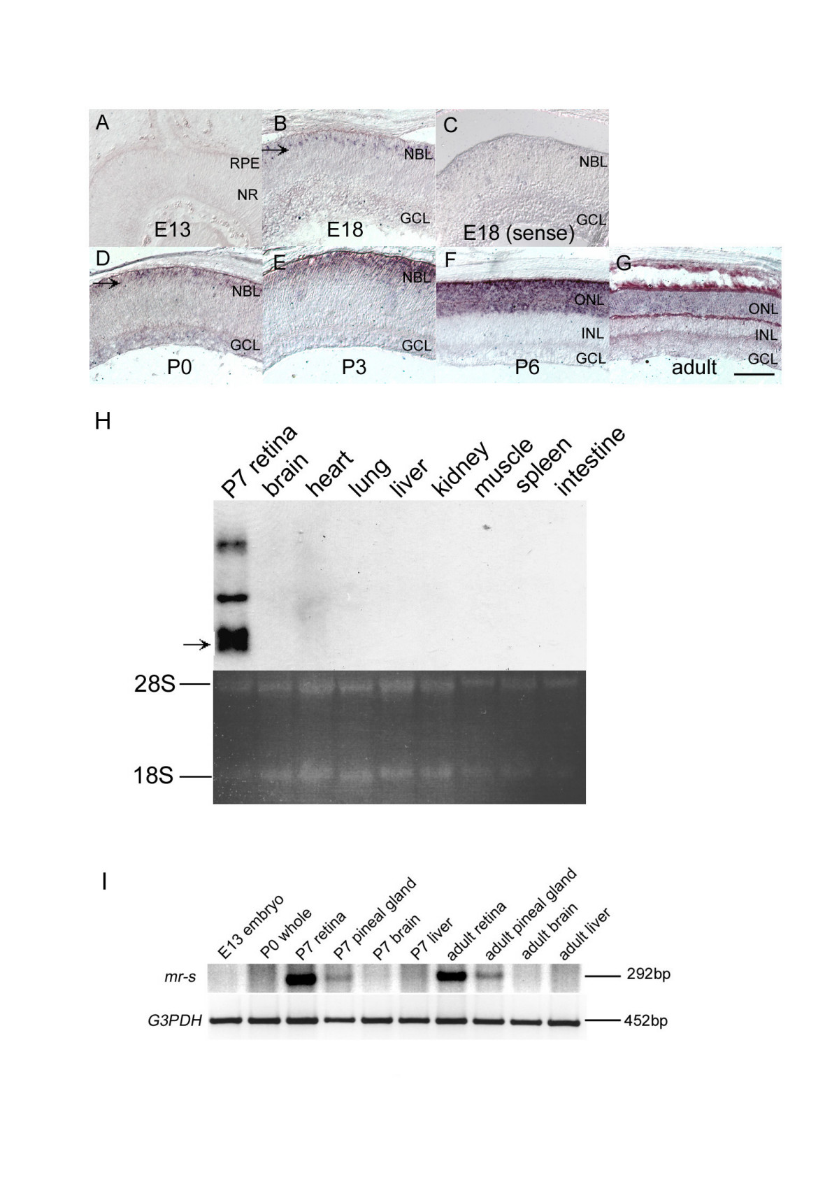Fig. 2 mr-s expression in developing mouse retina and pineal gland. (A-G) mr-s expression during development of the mouse retina. The in situ hybridization signal of mr-s was not detected at E13 (A). The signal (arrow) was first detected in the outer aspect of NBL at E18 (B). A strong mr-s signal was detected in outer layer of the retina at P3-P6, and then the signal decreased in the adult retina (E-G). Control with the sense probe in E18 retina is shown (C). Scale bar, 100 μm. (H) Northern blot analysis of mr-s expression in adult mouse organs. The arrow corresponds to 2.2kb mr-s transcript. (I) RT-PCR analysis of total RNAs extracted from E13 whole embryo, P0 whole body (except for the eye), P7 retina, P7 pineal gland, P7 brain, P7 liver, adult retina, adult pineal gland, adult brain and adult liver, respectively. RPE, retinal pigment epithelium; NR, neural retina; NBL, neuroblastic layer; GCL, ganglion cell layer; ONL, outer nuclear layer; INL, inner nuclear layer.