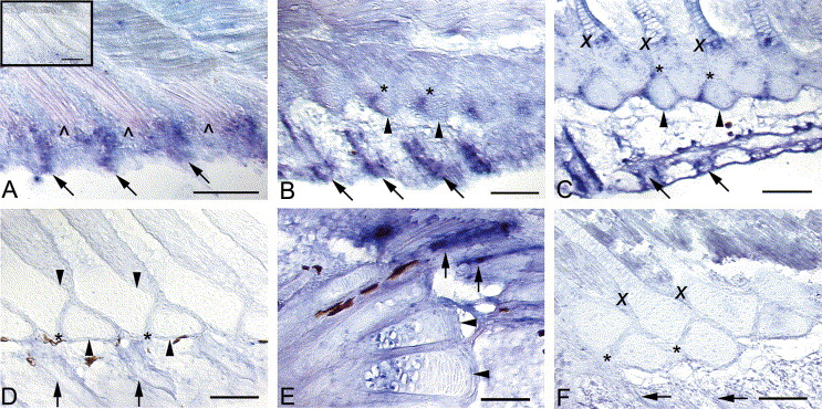 Fig. 4 Expression of bmp2b in the median fins of late-stage zebrafish. Arrows mark fin rays, arrowheads mark radials/hypurals. Black patches are melanophores. Anterior is to the left and dorsal to the top. Presumptive fin ray tissue within the anal fin fold expresses bmp2b, distal to the muscle buds () (5.2 mm NL) (A). Radials, not in this plane of section, but see inset, do not express bmp2b at this stage (A). Fin ray expression is maintained and a new domain of expression in the ZS (*) of the anal and dorsal fins is observed (5.5 mm) (B). A third domain of bmp2b expression in the maturing and hypertrophic chondrocytes (X) of the anal and dorsal fin radials develops in larger specimens; fin ray and ZS expression is maintained (6.0 mm) (C). By 7.3 mm, expression in the fin rays, ZS, and hypertrophic chondrocytes of the anal and dorsal fins is no longer detected (D). bmp2b expression is observed in caudal fin rays and in hypertrophic chondrocytes of the caudal fin supports, but not in mesenchyme or proliferative chondrocytes (6.6 mm) (E). No cells are distinctly labeled by bmp2b sense probe (6.6 mm) (F). Scale bars equal 0.05 mm.