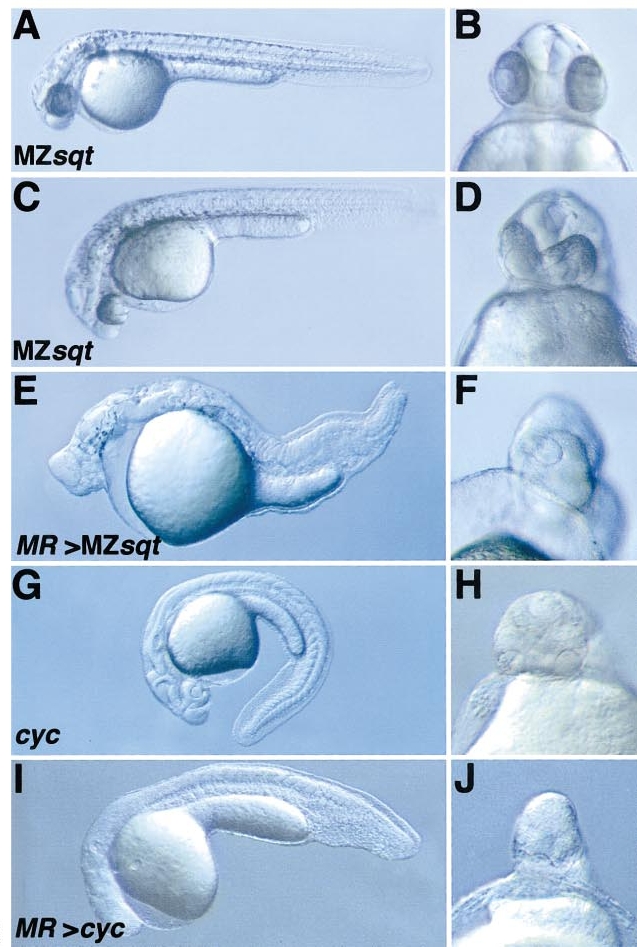 Fig. 5 tarMR enhances the phenotype of mutants with attenuated Nodal signalling. tarMR RNA was injected during the first cell cycle into mutant embryos and phenotypes of the injected embryos were analysed on 24- to 30-hpf live embryos presented as a lateral view from whole embryos (left column, anterior to the left) or as a frontal head view (right column). (A–D) Phenotypes of MZsqt mutants. The cross between homozygous individuals results in maternal–zygotic sqtcz35 mutants (MZsqtcz35) which exhibit a variable phenotype from almost normal (A, B) to more severe ones (C, D). When tarMR is overexpressed into MZsqtcz35 embryos, their phenotype is dramatically enhanced (E, F, 100%, n = 65). (G, H) Phenotypes of cycb16 homozygotes. Uninjected embryos exhibit a mild cyclopia and the absence of floor plate. When tarMR is overexpressed, their phenotype is slightly enhanced (I, J).