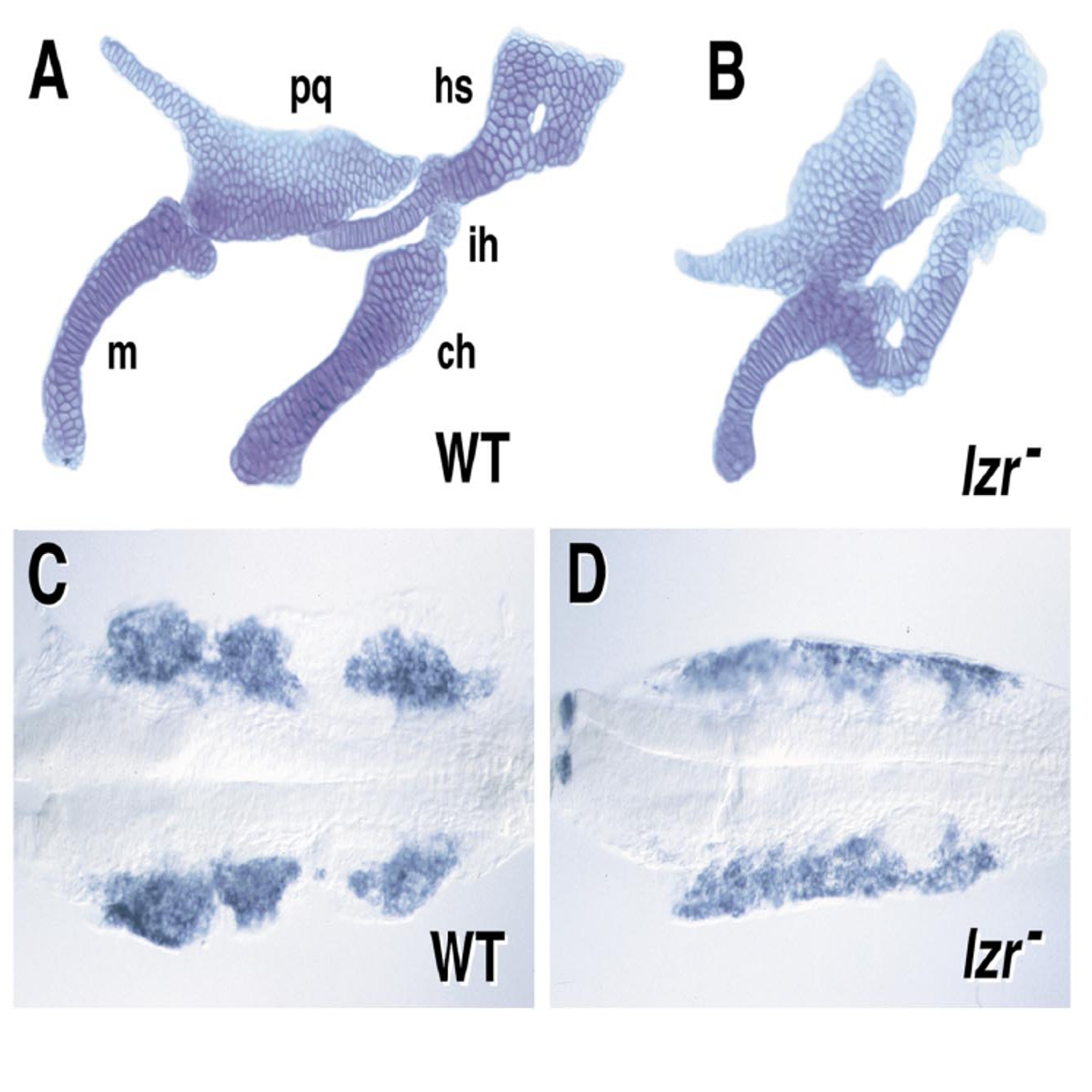 Fig. 5 Cartilage phenotypes and dlx2 expression in WT and lzr mutants, (from Pöpperl et al., 2000). (A, B) Alcian blue-stained, flat-mounted cartilages of the first and second pharyngeal segments prepared from day 4 embryos. Left side views, dorsal to the top and anterior to the left. In the WT (A) the elements are separated by joints. The abbreviations are as in Fig. 1. In the mutant (B) the dorsal elements as well as the ventral elements in the two segments are fused to one another. DV fusions within each segment occur as well; the DV joints are missing, as is the interhyal cartilage (ih) in the second segment. (C, D) Dorsal views (anterior to the left) of 20-h embryos labeled by RNA in situ hybridization for expression of dlx2. The three separate bilateral patches of expression in the WT (C) correspond to the three streams of postmigratory neural crest that have populated the pharyngeal arch primordia. The streams are fused together in the lzr mutant.