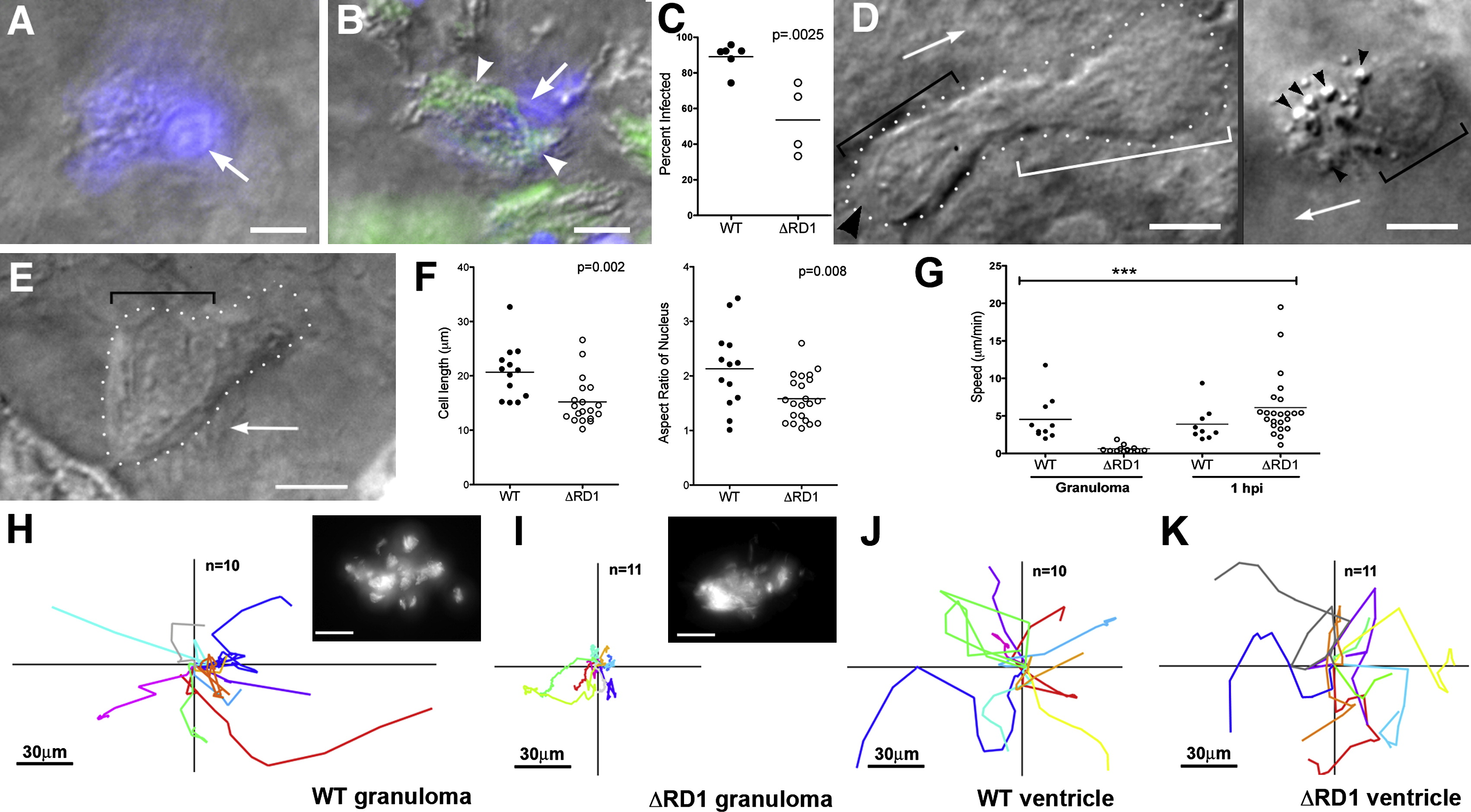 (G) Speeds of uninfected cells at WT or ΔRD1 granulomas, or at the site of injection 1 hr post-infection in the hindbrain ventricle. Bracket above indicates results of 1 way ANOVA (Kruskal-Wallis test)—uninfected cells at ΔRD1 granulomas (***) differed significantly from all others (p < 0.005), other differences not significant.