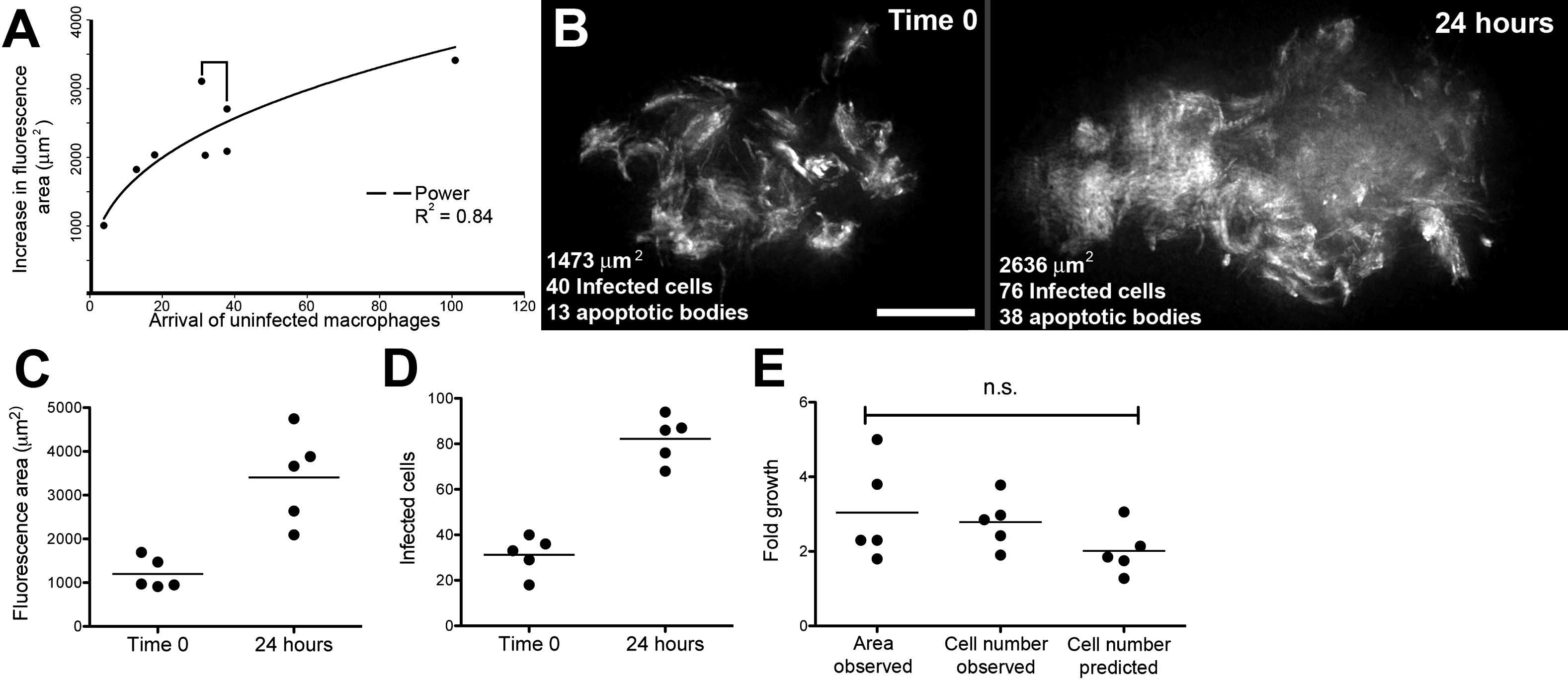 (C and D) Bacterial expansion in five granulomas over 24 hr as measured by (C) fluorescence area and (D) number of infected cells.