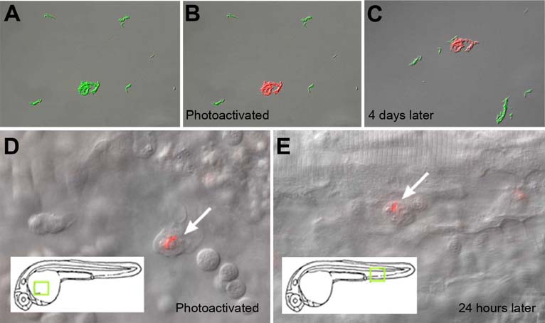 Fig. S4 M. marinum expressing Kaede photoactivatable protein to mark and track infected macrophages in vivo. (A-B) Merged image of photoactivated (red) and non-photoactivated (green) bacteria in medium immediately before (A) and after (B) photoactivation. (C) Same bacteria still detectable four days later. (D) Single macrophage containing photoactivated M. marinum (red channel only) in yolk circulation valley of embryo, immediately after photoactivation. (E) The same bacteria detected 24 hours later in caudal vein. Insets show location in embryo.