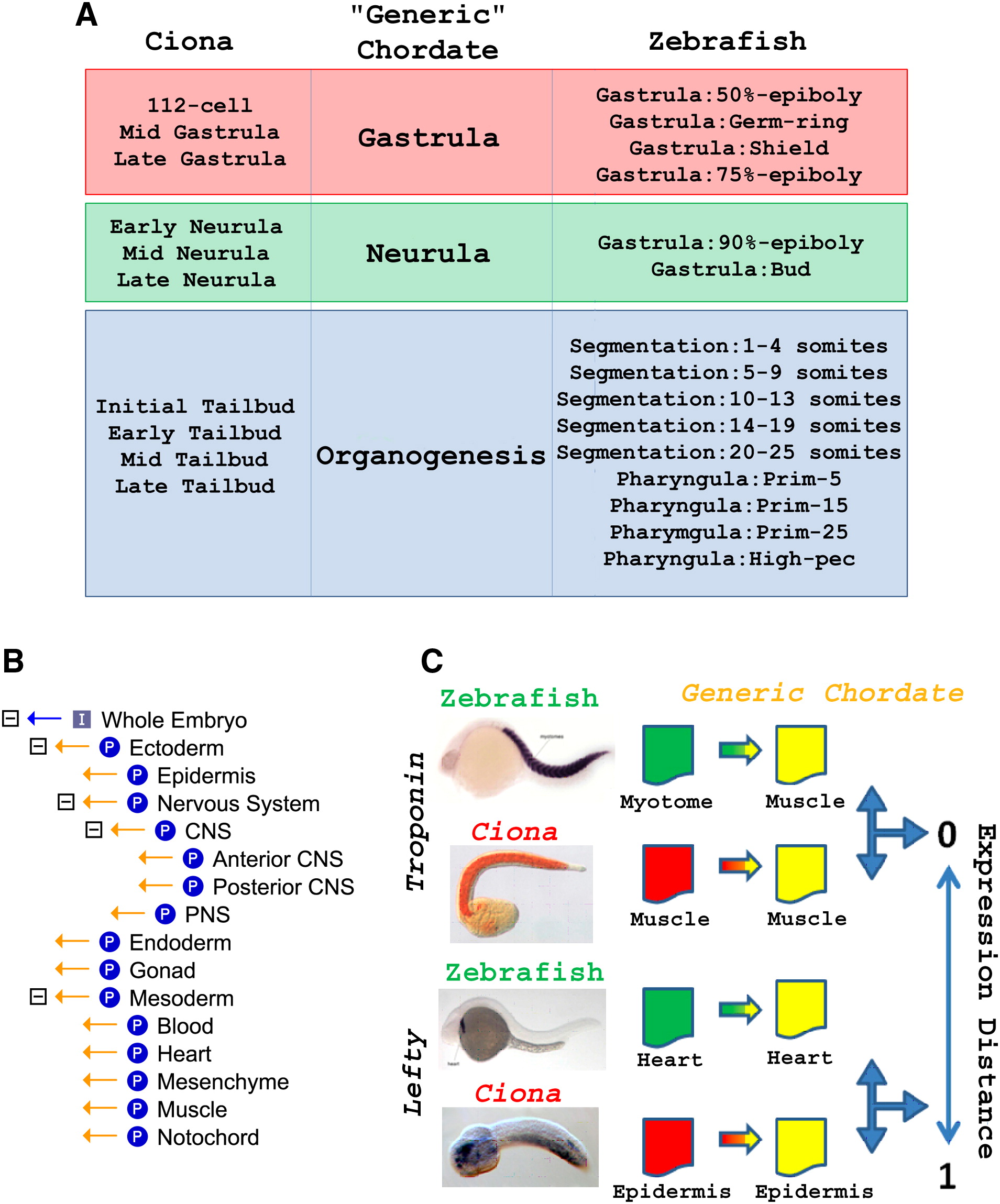 (C) General overview of the comparison process. Species-specific annotations were translated to the “General Chordate” ontology. Unified in situ hybridization (ISH) annotations of orthologous genes were then compared by using an expression distance (see Supplemental Experimental Procedures).
