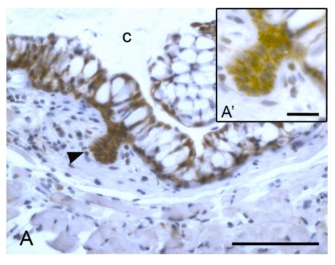 Fig. 4 Beta-catenin immunolocalization in the successional lamina. The onset of formation of a replacement tooth, the successional lamina, has strong p-catenin expression along the membrane of every cell (A, A′). This β-catenin expression co-localizes with the expression of E-cadherin suggesting that the cadherin-catenin complex is functional as adhesive force. arrowhead: successional lamina; c: crypt surrounding the tip of the functional predecessor. Scale bar = 50 μm, scale bar A′ = 15 μm.
